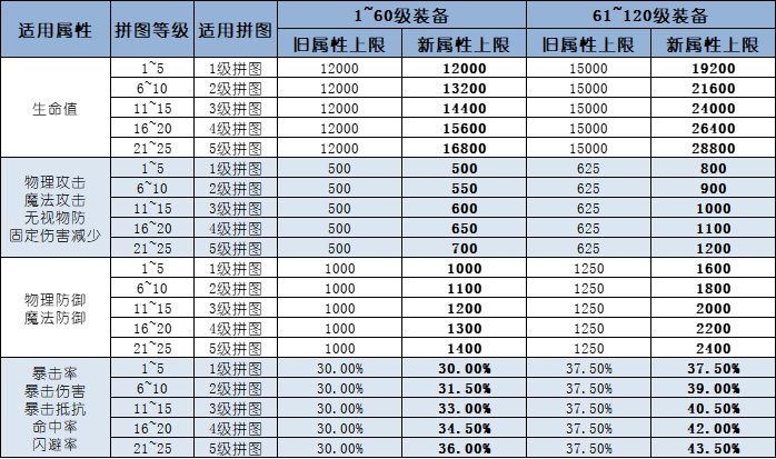 二、拼图属性转移表现 1)「低等级装备」和「高等级装备」的定义 装备按等级区间进行划分,具体为:「1~60级」、「61~120级」、「121级以上」。 同等级区间视为平级(121级以上装备因角色等级暂未开放,无明确分段),若两件装备分别属于不同区间则进入「低等级装备」和「高等级装备」的判断。 2)同区间内装备转移「拼图」属性 同区间装备因判断为平级,故转移继承的「拼图等级」和属性值不变。