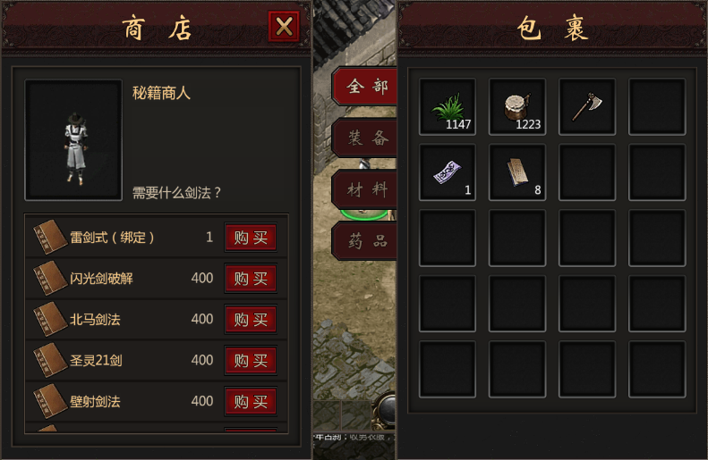 练功顺序建议:槌法,枪法,刀法,剑法,拳法,按武功恢复高低来,恢复低的打怪的时候升级容易一点。 不同武功之间存在克制关系 武功秘籍购买需要钱币(出售材料或不愿意刷怪可以直接摇钱树) ![]()